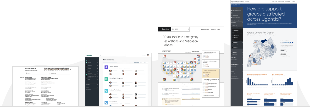 Specializing in the intersection of psychology and design allows us to bring a unique perspective on the ways that data can both reflect and influence people's attitudes, beliefs, emotions, and behaviors. At the same time, technical, analytical, and research expertise allow us to find incisive, inclusive stories in even the most complex datasets.